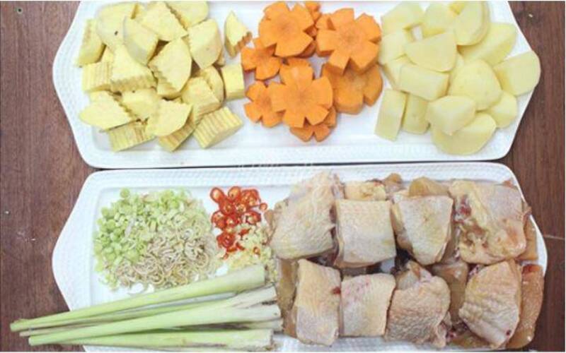 Khoai tây, khoai lang và cà rốt gọt vỏ, cắt khối vừa phải rồi ngâm nước muối loãng khoảng 10 phút để hạn chế oxy hóa. Hành tây, sả, hành tím và tỏi băm nhuyễn.