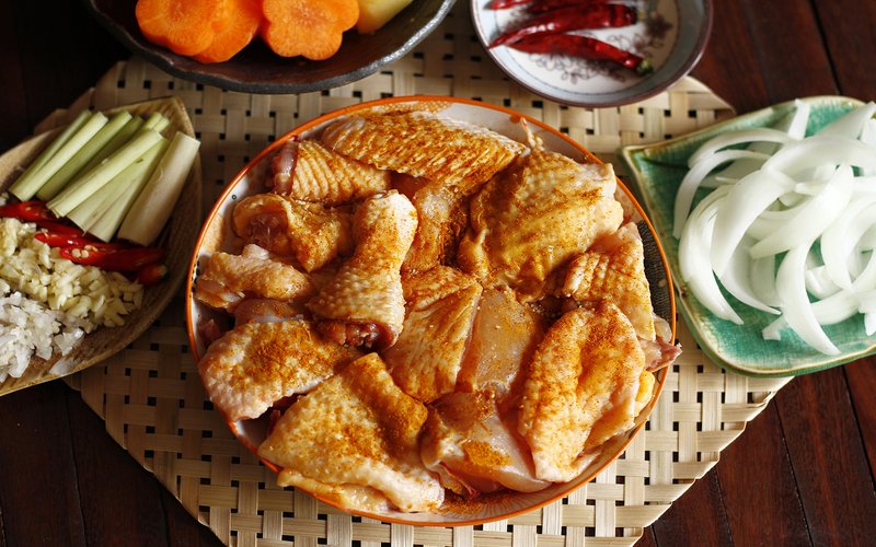 Ướp thịt gà là khâu tạo nền vị chủ đạo cho toàn bộ món ăn. Cho gà vào tô lớn, thêm hành tím, tỏi băm cùng gia vị theo tỷ lệ: 1 gói bột cà ri, 3 thìa cà phê muối, 2 thìa cà phê đường, 2 thìa cà phê sa tế, 1 thìa cà phê hạt nêm, 1 thìa cà phê tiêu và 1 thìa dầu điều (nếu dùng).